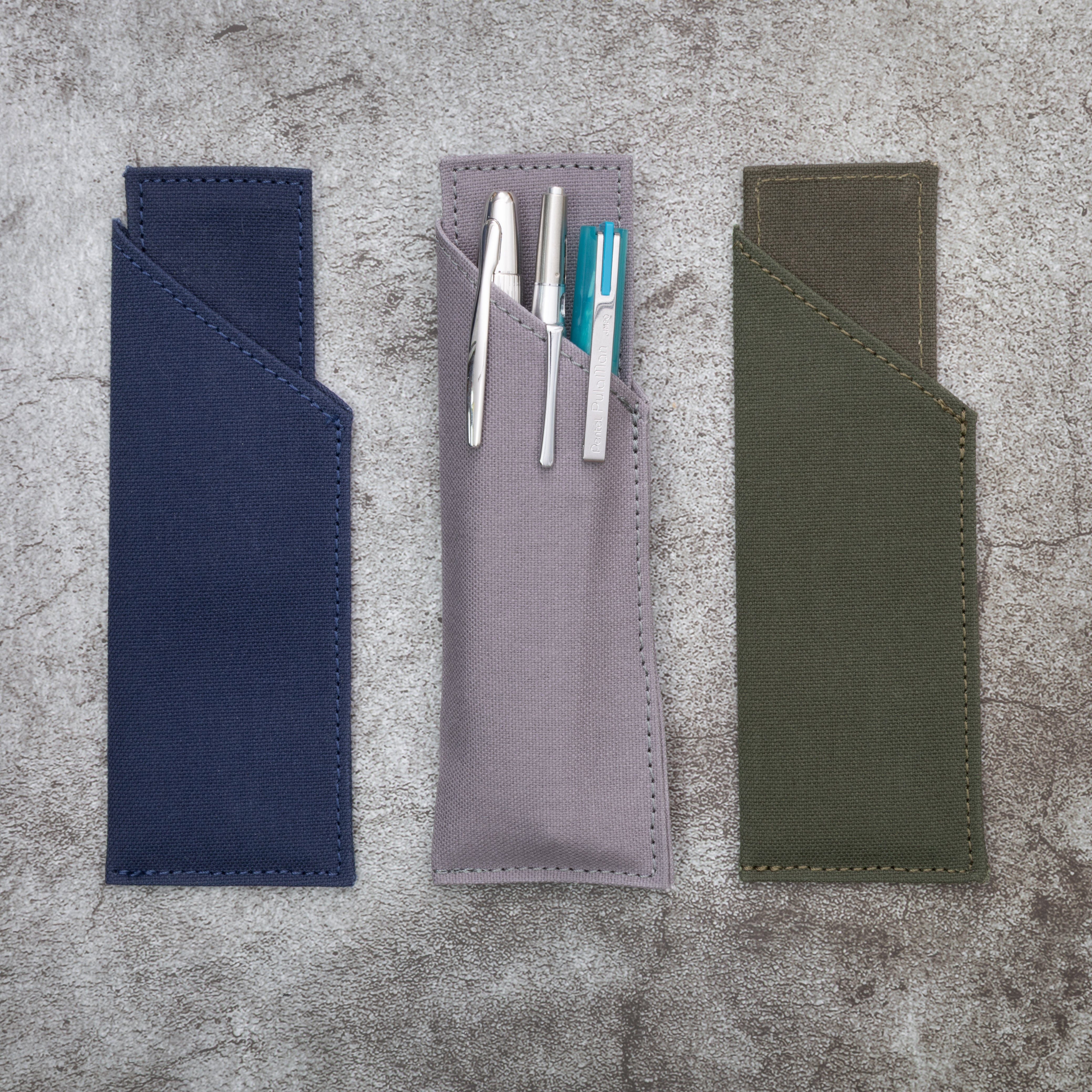 シンプルな構造で各面に2〜3本程度のペンを差し込む事ができる帆布製のペンシース状ペンケースです。