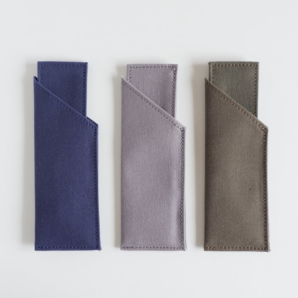 シンプルな構造で各面に2〜3本程度のペンを差し込む事ができる帆布製のペンシース状ペンケースです。