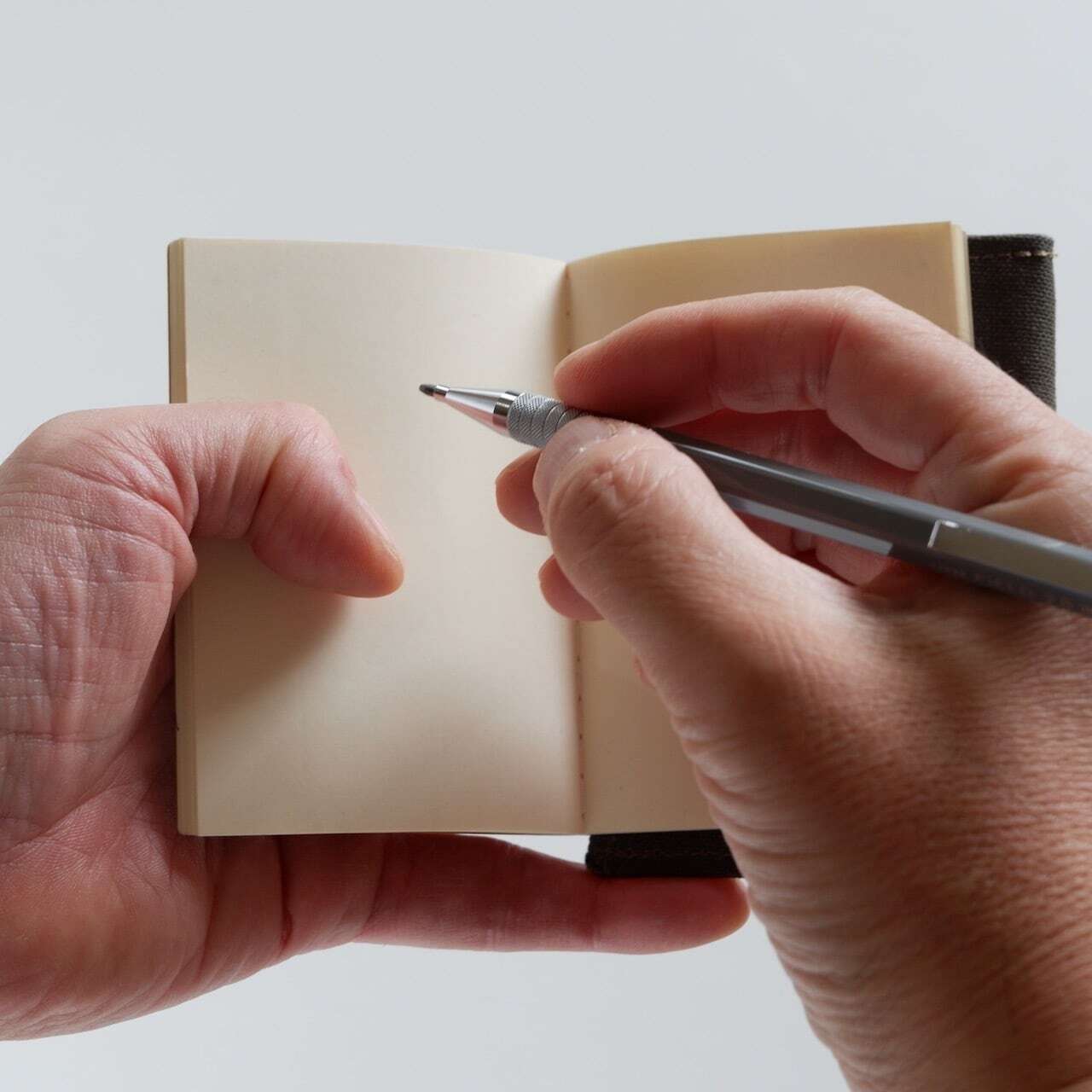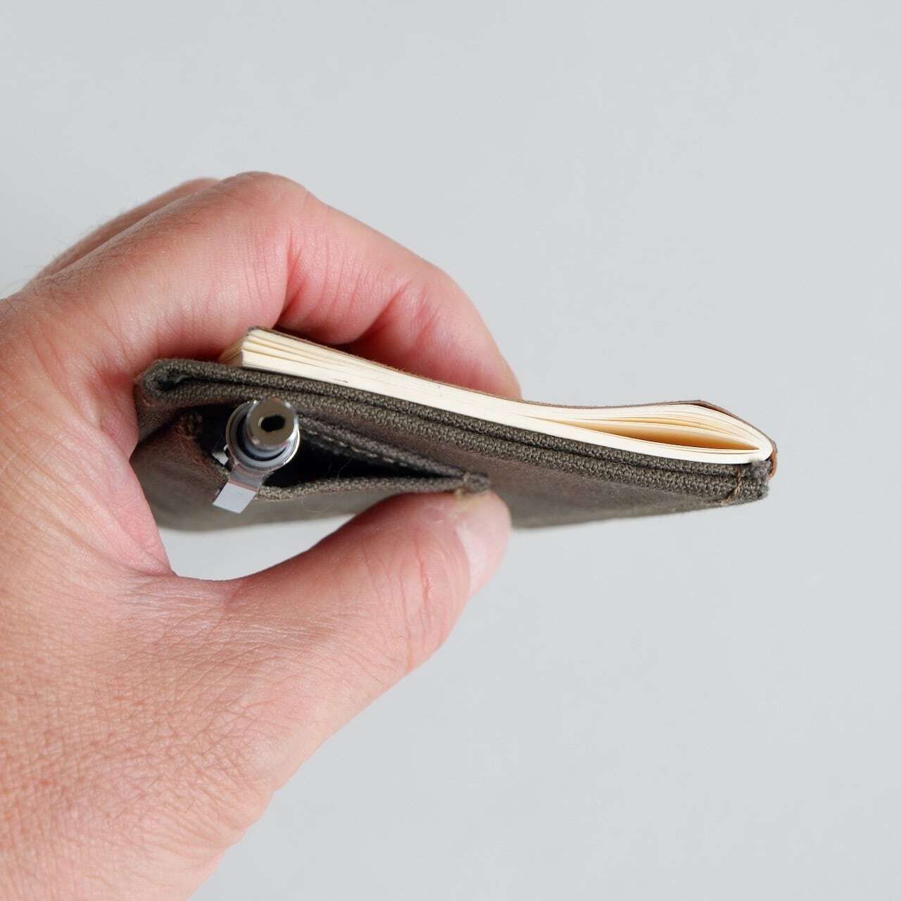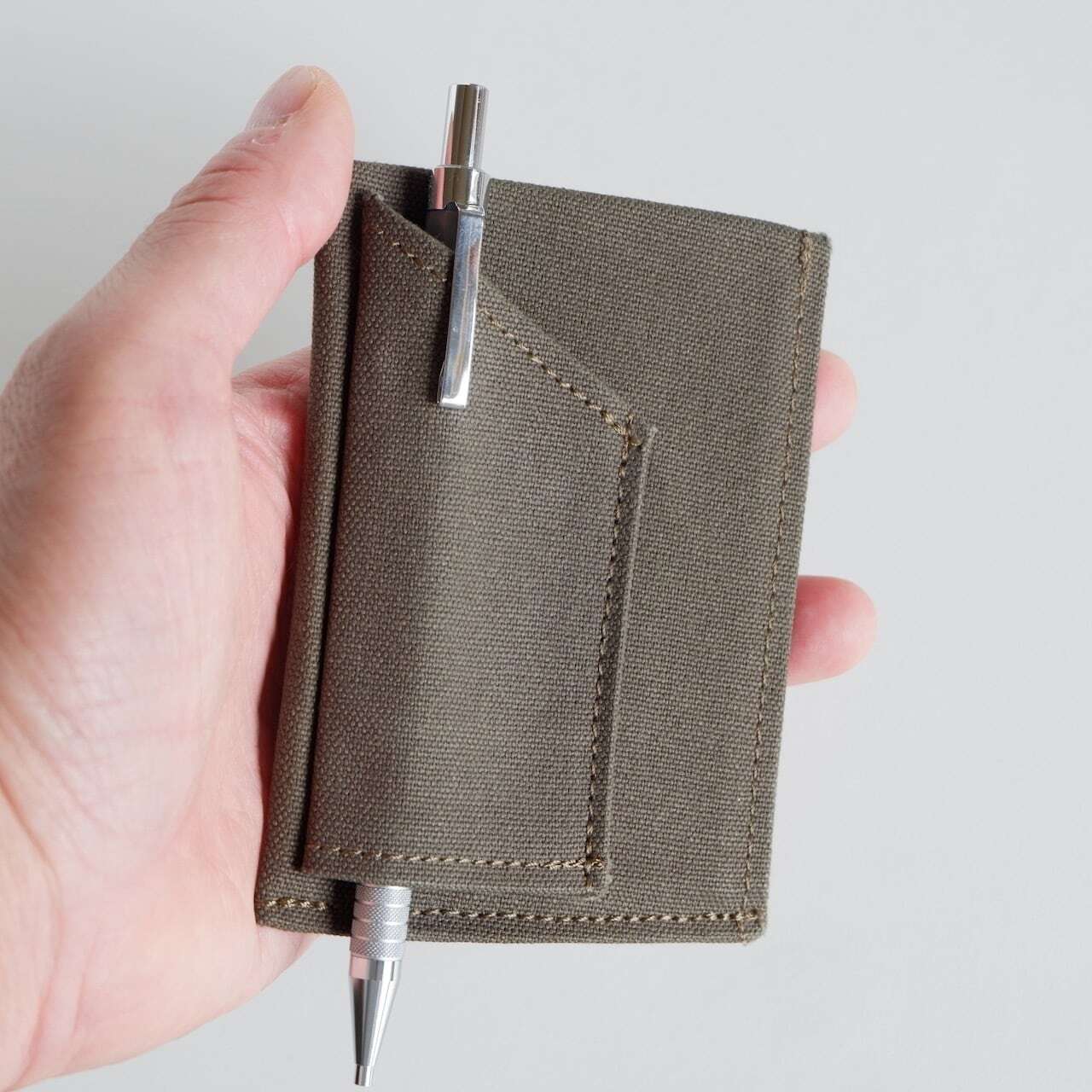 市販の小さなA7サイズのノートやメモとペンをセットして携帯できるアイテムです。