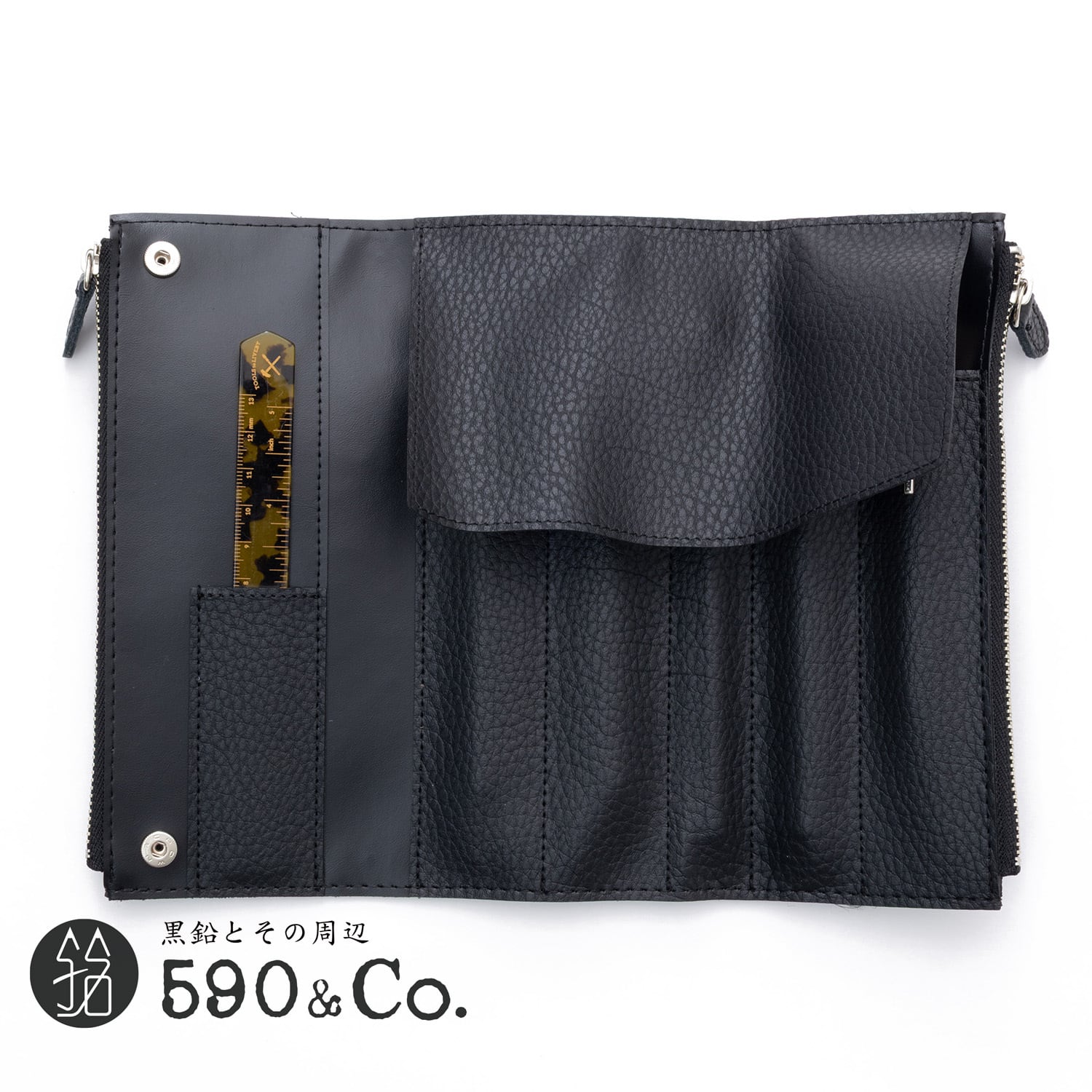 書く人の必需品を、洗練のケースに 最大4本のペンをスマートかつ守り定規や芯 ケース、付箋などの小物を収まる実用的なレイ アウトです