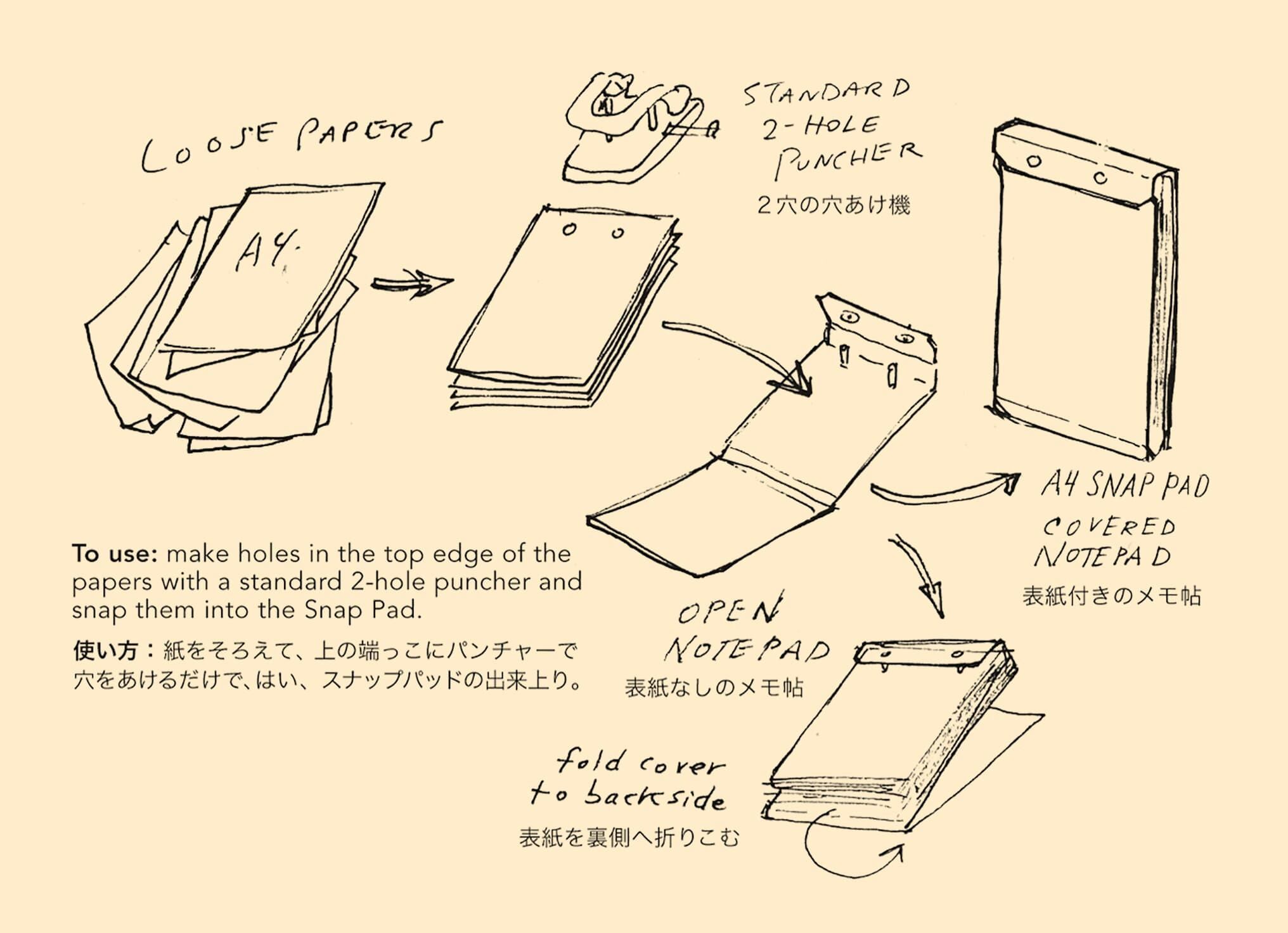 紙をそろえて、上の端に2穴パンチで穴を開けて綴じればスナップパッドの出来上りです。どこへでも持ち運びやすく、かさばらない。A5サイズを使うときはA4の紙を半分に、A6サイズを使うときはA4の紙を4等分にカットして、おなじ手順。 コピー用紙約100枚を留められます。